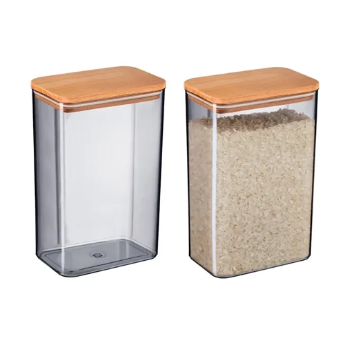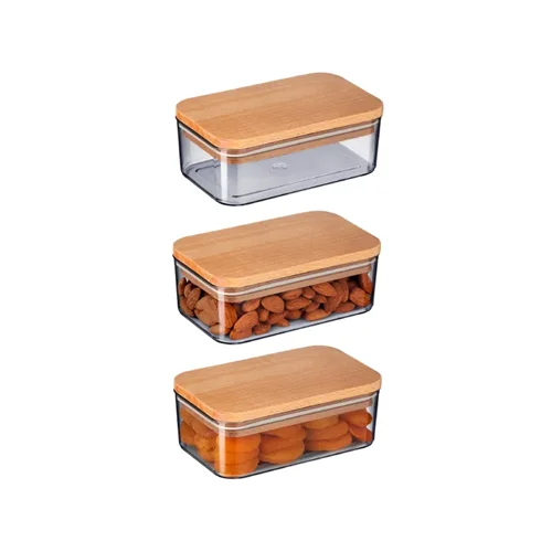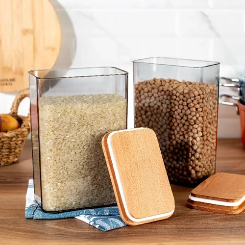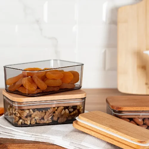 بانکههای چوبی به آشپزخانهها حس طبیعی و گرم میدهند. این بانکهها معمولاً ترکیبی از بدنه شیشهای یا سرامیکی با دربهای چوبی از جنس چوبهای باکیفیت مانند بامبو یا چوب گردو هستند. چوب به دلیل خاصیت طبیعی خود در جذب رطوبت، میتواند به حفظ دمای مناسب برای نگهداری مواد غذایی کمک کند. دربهای چوبی این بانکهها معمولاً دارای واشرهای سیلیکونی برای جلوگیری از نفوذ هوا و رطوبت هستند که این ویژگی به تازگی مواد داخل ظرف کمک میکند.