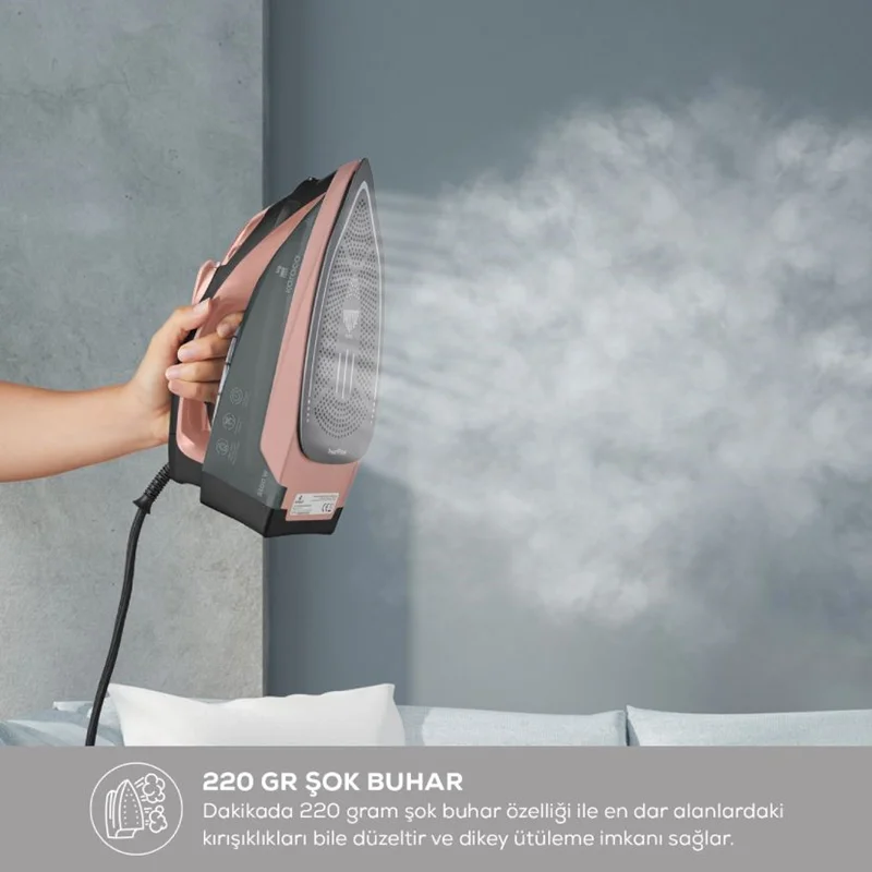 به لطف ویژگی بخار شوک 220 گرم در دقیقه، سرسخت ترین چین و چروک ها را از بین می برد و اتوی عمودی موثر را امکان پذیر می کند.