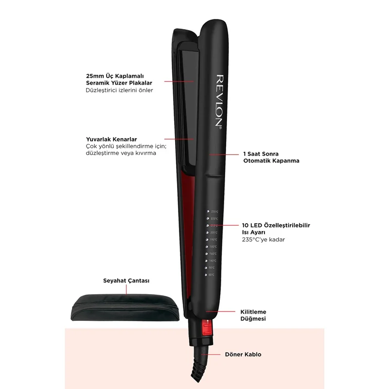 خاموش شدن خودکار پس از 1 ساعت، ویژگی حرارتی قابل تنظیم 10 LED (تا 235 درجه سانتیگراد)، حمل آسان با کیف مسافرتی، دکمه قفل، استفاده آسان با سیم چرخان، جلوگیری از ایجاد خط صاف کننده به لطف صفحات سرامیکی سه روکش 25 میلی متری، لبه گرد ویژگی ها، یک ظاهر طراحی همه کاره و به ما امکان می دهد صاف و فر شوند.