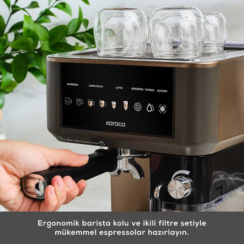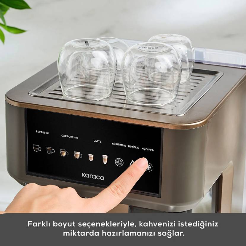 با دستگاه اسپرسوساز خودکار Karaca MyCaffe Barista S10 می توانید قهوه هایی مانند اسپرسو، لاته، کاپوچینو، آمریکانو، فلت وایت، کورتادو، ماکیاتو، لانگو، آفوگاتو، آیس لاته، آیس کاپوچینو و آیس آمریکانو را با قوام کامل تهیه کنید. دستگاه قهوه ساز شما که با دقت طراحی شده است،تجربه باریستا واقعی را در راحتی خانه شما ارائه می دهد و به شما امکان می دهد یک قهوه درجه یک را تجربه کنید. به لطف کنترل حجمی MyCaffe Barista، می توانید اندازه نوشیدنی هایی را که تهیه می کنید به اندازه دلخواه خود انتخاب کنید. با مخزن شیر یکپارچه می توانید کف شیر غلیظ را برای قهوه هایی مانند کاپوچینو، لاته تهیه کنید. در حالی که سیستم کنترل لمسی تنها با یک لمس شما را تحت کنترل فرآیند تهیه قهوه قرار می دهد، اما با قدرت 1350 وات و فشار 15 بار، دما و قوام نوشیدنی شما را کاملاً تنظیم می کند و مخزن بزرگ آب 1.8 لیتری قهوه بدون وقفه را ارائه می دهد.می توانید فنجان های قهوه خود را از قبل گرم کنید. با سیستم گرمایش ترموبلاک می توانید به سرعت به حالت کف کردن شیر بروید و نوشیدنی های خود را به بهترین شکل آماده کنید. به لطف خاموش شدن خودکار، محافظت در برابر گرمای بیش از حد و فشار بسیار ایمن است و با محفظه شیر قابل جابجایی و سینی چکه به راحتی تمیز می شود.