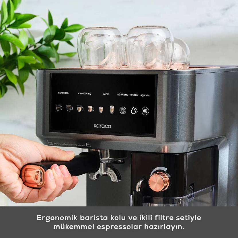 با دستگاه اسپرسوساز خودکار Karaca MyCaffe Barista S10 می توانید قهوه هایی مانند اسپرسو، لاته، کاپوچینو، آمریکانو، فلت وایت، کورتادو، ماکیاتو، لانگو، آفوگاتو، آیس لاته، آیس کاپوچینو و آیس آمریکانو را با قوام کامل تهیه کنید. دستگاه قهوه ساز شما که با دقت طراحی شده است،تجربه باریستا واقعی را در راحتی خانه شما ارائه می دهد و به شما امکان می دهد یک قهوه درجه یک را تجربه کنید. به لطف کنترل حجمی MyCaffe Barista، می توانید اندازه نوشیدنی هایی را که تهیه می کنید به اندازه دلخواه خود انتخاب کنید. با مخزن شیر یکپارچه می توانید کف شیر غلیظ را برای قهوه هایی مانند کاپوچینو، لاته تهیه کنید. در حالی که سیستم کنترل لمسی تنها با یک لمس شما را تحت کنترل فرآیند تهیه قهوه قرار می دهد، اما با قدرت 1350 وات و فشار 15 بار، دما و قوام نوشیدنی شما را کاملاً تنظیم می کند و مخزن بزرگ آب 1.8 لیتری قهوه بدون وقفه را ارائه می دهد.می توانید فنجان های قهوه خود را از قبل گرم کنید. با سیستم گرمایش ترموبلاک می توانید به سرعت به حالت کف کردن شیر بروید و نوشیدنی های خود را به بهترین شکل آماده کنید. به لطف خاموش شدن خودکار، محافظت در برابر گرمای بیش از حد و فشار بسیار ایمن است و با محفظه شیر قابل جابجایی و سینی چکه به راحتی تمیز می شود.