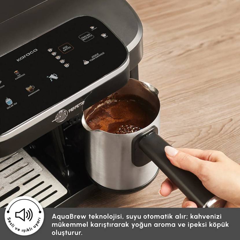 فناوری AquaBrew در Hatır Perfetto، قهوه ترک شما را هنگام پاشیدن آب، کاملاً مخلوط میکند و به شما امکان میدهد طعمی غنی و کفی خامهای به دست آورید.