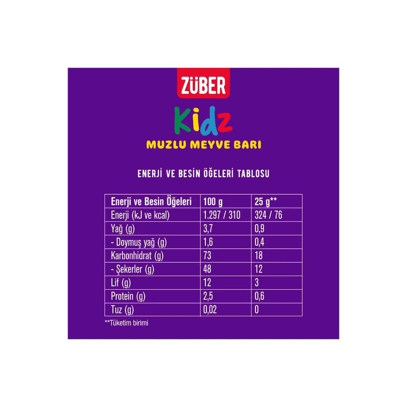 - بار میوهای موزی زوبر ویژه کودکان، میانوعدهای خوشمزه برای مدرسه و سفر است؛ هر بار ۲۵ گرم بوده و بهراحتی در کیف جا میشود.