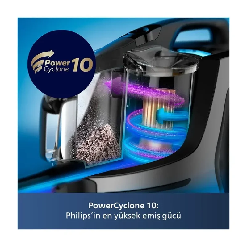 فناوری پیشرفته PowerCyclone 10 فناوری فیلیپس است که قدرت مکش قدرتمندی را ارائه می دهد. طراحی شده برای به حداکثر رساندن جریان هوا با عملکرد چرخشی قدرتمند. جریان هوای بسیار تسریع شده در محفظه استوانه ای به طور موثر گرد و غبار را از هوا جدا می کند و عملکرد بالای آن را بر روی انواع کثیفی ها و کف ها ارائه می دهد.