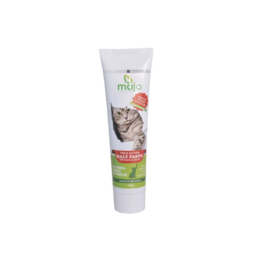 - خمیر مالت گربه ماجو 100 گرم، مکملی خوشطعم و آماده مصرف برای کاهش تشکیل گلولههای مو و کمک به عبور موهای بلعیدهشده از دستگاه گوارش گربهها.