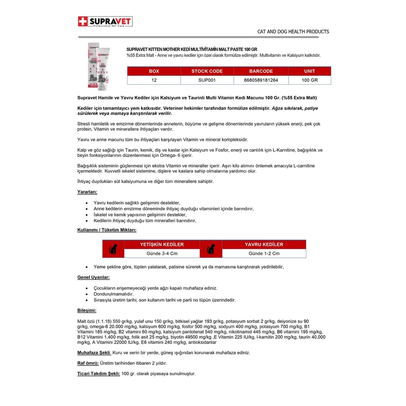 - خمیر چندویتامینه سوپراوت برای گربههای باردار و بچهگربهها فرمولاسیونی غنی از کلسیم و تائورین دارد؛ بهراحتی قابل مصرف و مناسب برای تقویت رشد و سلامت مادر و نوزاد.