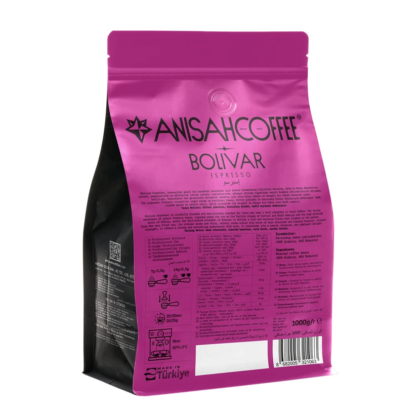 - قهوه اسپرسو بولیوار با روست تیره، بدنی پر و طعمی غنی ارائه میشود؛ مناسب برای تهیه شاتهای اسپرسو و نوشیدنیهای شیری با کرمای خوب.