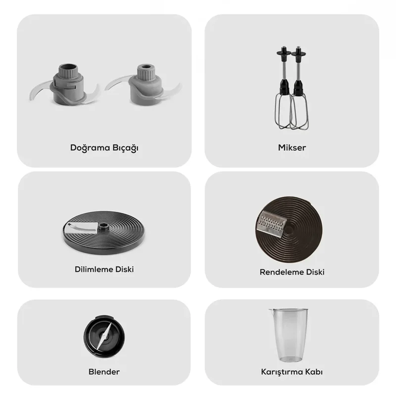 دارای 6 عملکرد مخلوط کردن ، کوبیدن ، برش دادن ، خرد کردن ، رنده کردن ، هم زدن