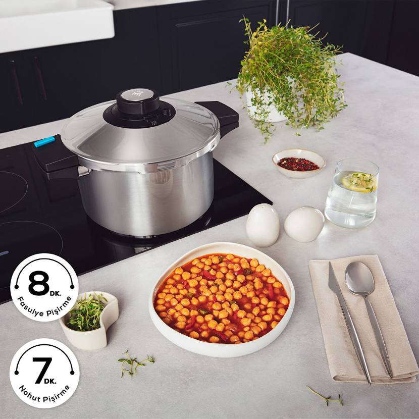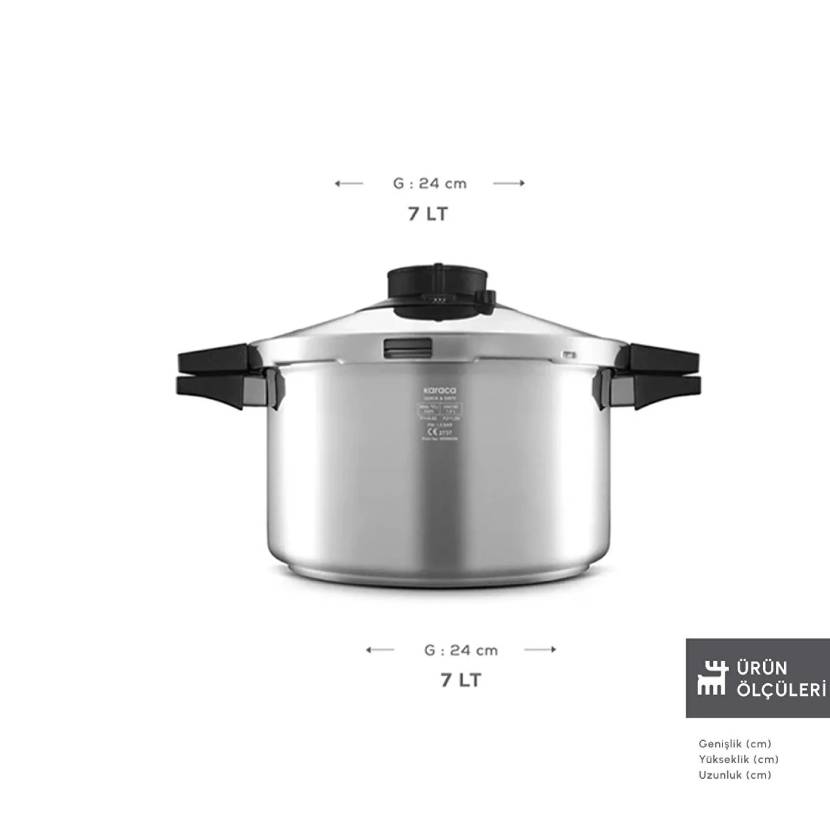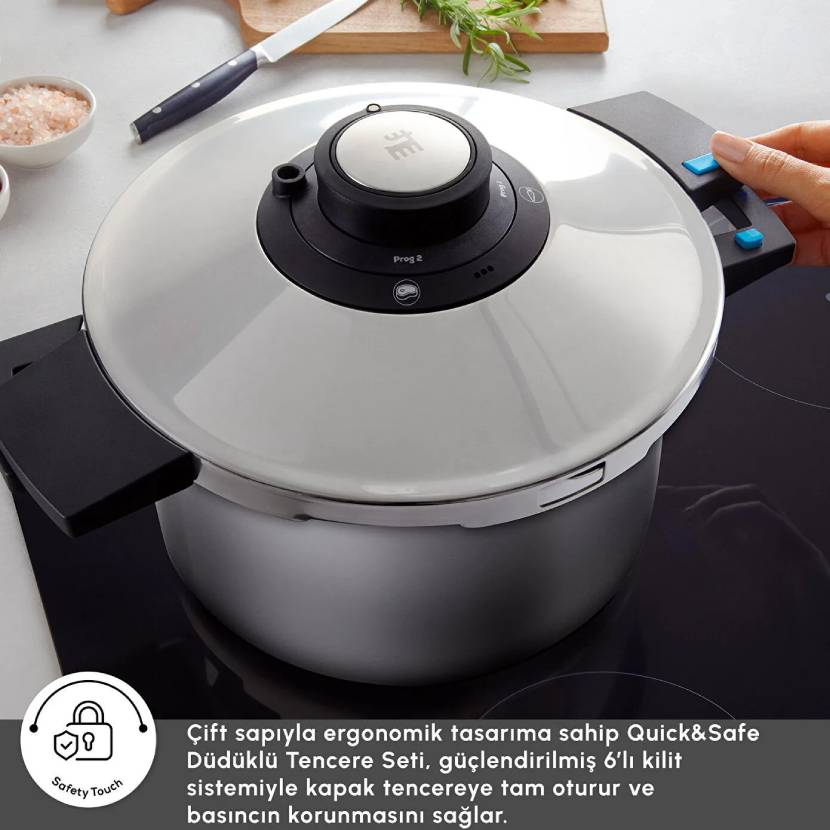 زودپز Karaca Quick&Safe که با سیستم 6 قفل کاملا ایمن فشار دیگ را حفظ می کند با فشار سنج رنگی خود نیز اطلاعاتی در مورد وضعیت فشار در دیگ ارائه می دهد.یک حلقه سبز روشن نشان دهنده افزایش فشار و یک حلقه سبز تیره نشان دهنده رسیدن به سطح پخت است. با تشکر از 2 برنامه مختلف؛ سوپ و سبزیجات را در برنامه 1، گوشت و حبوبات را در برنامه 2 به قوام کامل می پزد.به لطف بدنه فولادی با ضخامت 1.5 میلی متری با افزایش ضخامت P، غذا برای مدت طولانی تری گرم می ماند و در عین حال تعادل ویتامین، عطر و مواد معدنی تمامی مواد را حفظ کرده و طعم را افزایش می دهد. علاوه بر این، می توان از آن بر روی تمام اجاق ها از جمله القایی استفاده کرد.ست زودپز Karaca Quick&Safe که دارای طراحی ارگونومیک با دسته دوبل خود است، فضای کمتری را نسبت به سایر زودپزها اشغال می کند و در عین حال حمل و نقل متعادل و آسانی را ارائه می دهد.