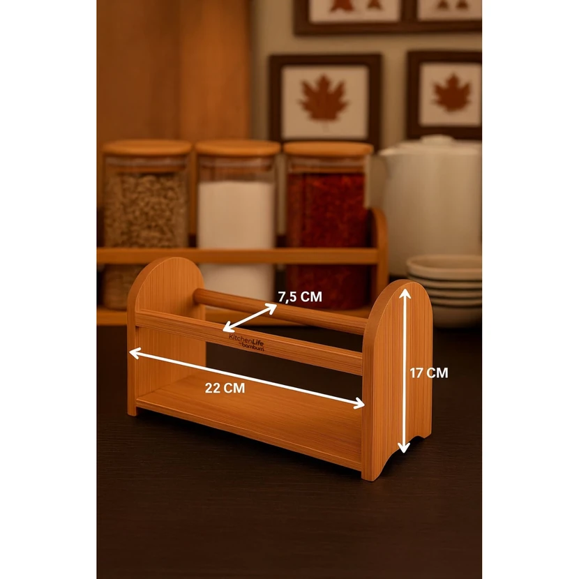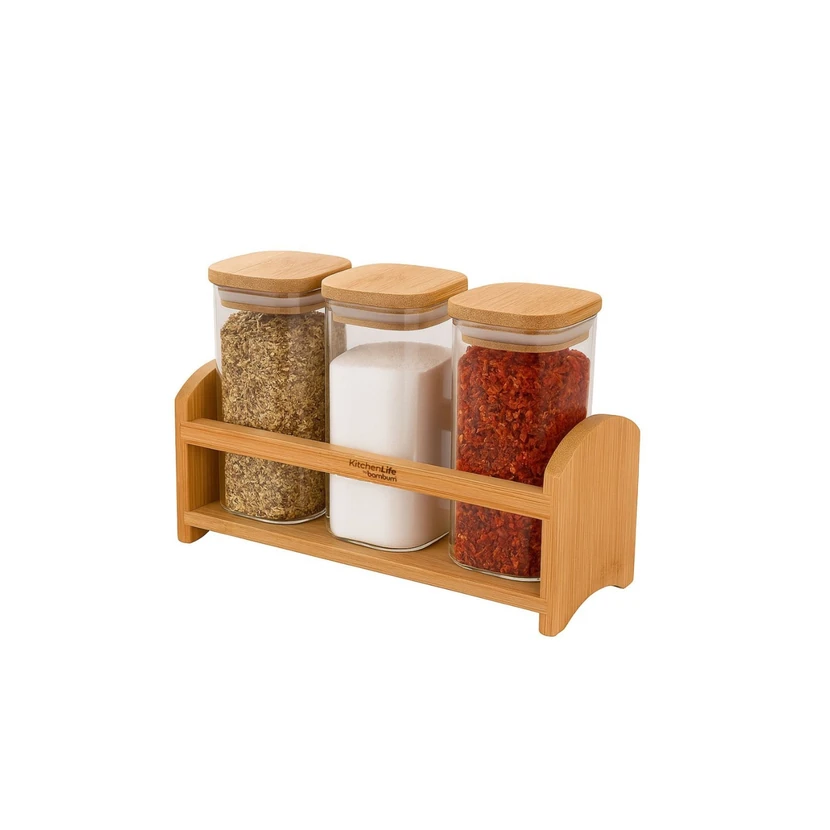 - ست ادویه 4 پارچه کیچن لایف ساختهشده از بامبو با استند ایستاده و درپوش مناسب برای نظمدهی روی میز و نگهداری نمک، فلفل و ادویههای پرکاربرد.