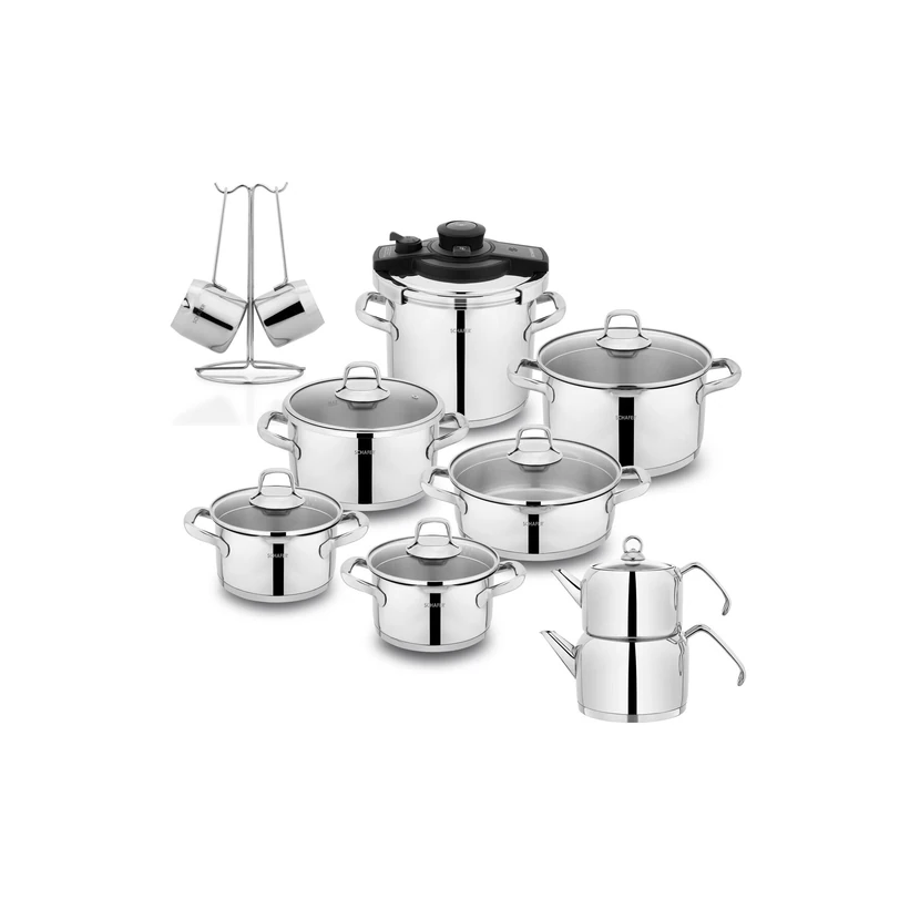 - ست جهیزیه 18 پارچه استیل شافر جول؛ سرویس کامل آشپزخانه از استیل ضدزنگ با طراحی زیبا و دوام بالا که برای جهیزیه و استفاده روزمره مناسب است.