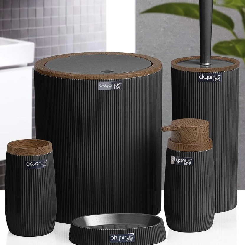 Okyanus Home Siyah Ahşap Çizgili Yuvarlak 5'li Banyo Seti