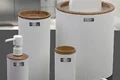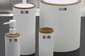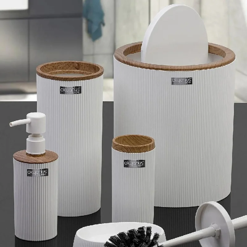 Okyanus Home Mina Beyaz Ahşap Desenli Çizgili Yuvarlak 5'li Banyo Seti
