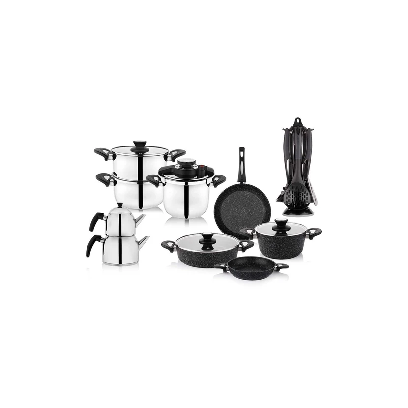 - صافی ۲۲ سانتیمتری، زودپز ۴ و ۶.۵ لیتری، ماهیتابه ۲۰ سانتیمتری، قابلمه ۲۰ سانتیمتری، دیس ۲۶ سانتیمتری، ماهیتابه ۲۶ سانتیمتری، قوری ۳ تکه، سرویس سرو ۶ تکه. جنس استیل ضد زنگ: کروم نیکل ۱۸/۱۰. دستههای ارگونومیک از جنس باکالیت برای راحتی در دست گرفتن و جلوگیری از سوختگی. پایه کپسولی برای صرفهجویی در گرما و انرژی. مناسب برای انواع اجاق گاز. قابل شستشو در ماشین ظرفشویی.