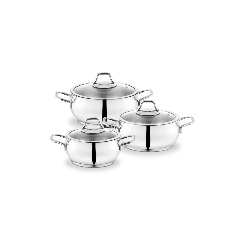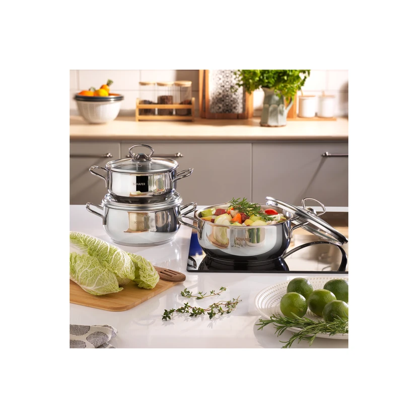 - ست قابلمه 6 پارچه شافر از استیل با کیفیت بالا طراحی شده تا پخت یکنواخت، دوام طولانی و ظاهر شیک را در آشپزخانه شما فراهم کند؛ مناسب برای استفاده روزمره و آشپزی حرفهای.