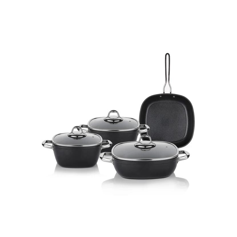 - ست قابلمه 7 پارچه شافر برای پخت و پز حرفهای و خانگی طراحی شده؛ ساخت ترکیه با ظاهر مشکی و پوشش گرانیت برای پخش حرارت یکنواخت و عملکرد مطلوب.