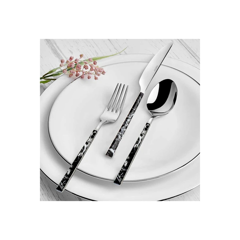 - ست 36 پارچه نهیر تولیپ نقرهای با دسته مشکی مرمری از استیل ضد زنگ مرغوب ساخته شده و برای سرو غذا تا 6 نفر مناسب است؛ طراحی شیک و بادوام آن هم برای استفاده روزمره و هم مهمانیها ایدهآل است.