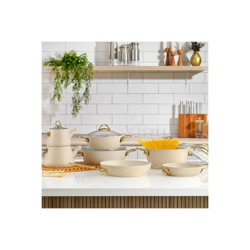 - ست پختوپز 11 پارچه شافر سفید؛ ترکیبی از آلومینیوم و استیل با طراحی مقاوم و انتقال حرارت یکنواخت. مناسب استفاده روی اجاق القایی، برای آشپزی روزمره و هدیه جهیزیه. هنگام خرید به تعداد قطعات و سازگاری با اجاق توجه کنید.