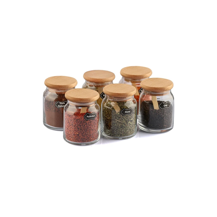 - ست 6 تایی جا ادویه بامبو با درب و قاشق از برند کارچیچهگی هوم، راهکاری شیک و منظم برای نگهداری ادویهها در آشپزخانه و میز غذاخوری.