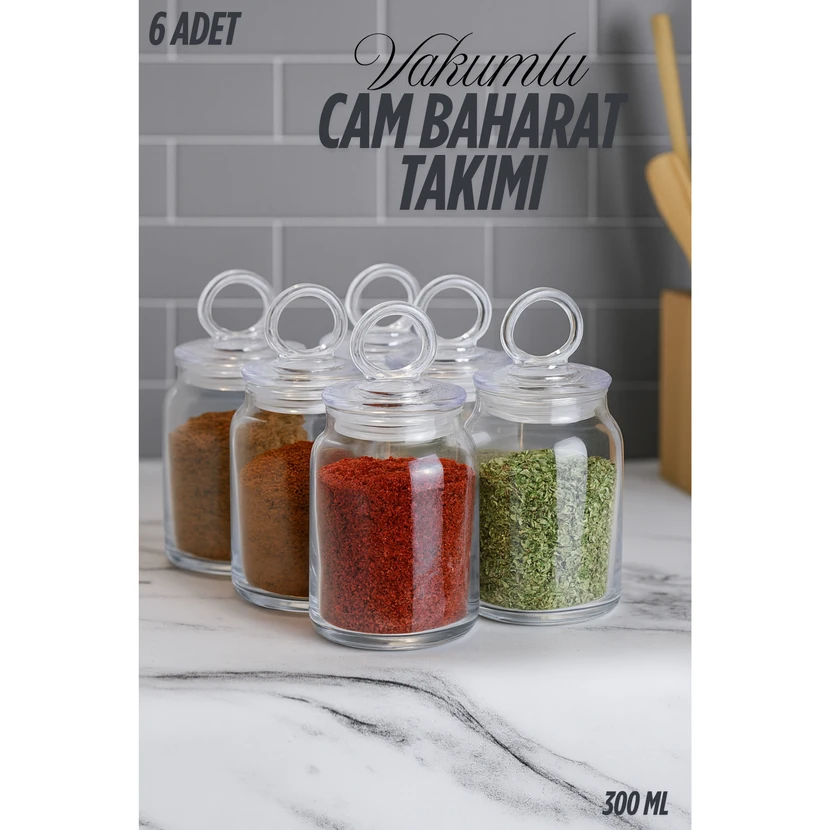 - ست 6 تکه ادویهدان شیشهای وکیوم لوکس؛ بدنه شفاف و مقاوم برای نگهداری بهداشتی و مرتب ادویهها.