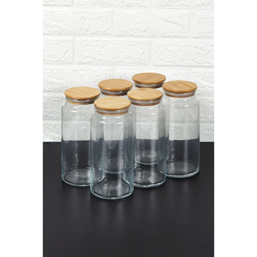 - ست ۶ تکه شیشهای با درب بامبو و مکانیزم وکیوم، با ظرفیت کلی ۱۴۴۰ میلیلیتر، مناسب نگهداری ادویه، خشکبار و مواد آشپزخانه؛ طراحی شفاف و مدرن برای مرتبسازی آشپزخانه.