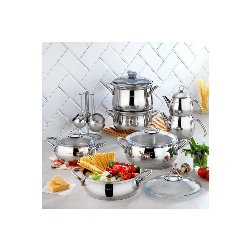 - سرویس جهیزیه استیل شافر آلیا 18 پارچه با رنگ نقرهای، طراحی شیک و مناسب برای آشپزخانههای مدرن است. مجموعهای کامل از ظروف کاربردی برای پخت، سرو و پذیرایی.