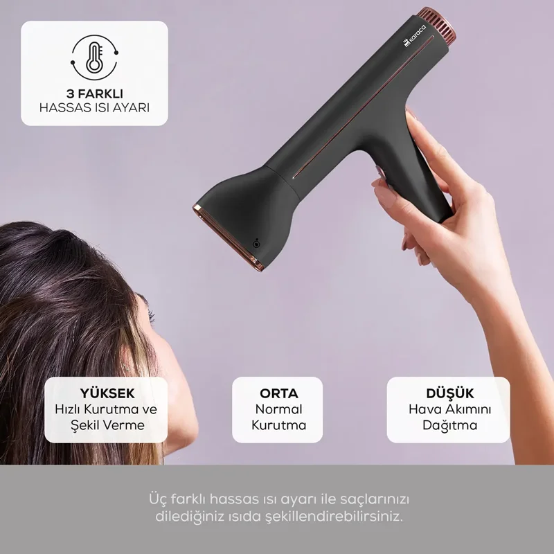 در حالی که سشوار Karaca Hypersonic D2 عملکرد بالایی را با 1200 وات BLDC نشان می دهد. با صدای کم خود به شما این امکان را می دهد که در هر زمانی از روز موهای خود را خشک کنید. با خشک کردن موها در 3 دقیقه، تجربه خشک کردن سریعتر مو را فراهم می کند.