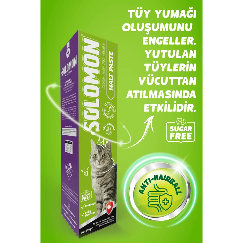 - خمیر مالت سولومون 100 گرم برای پیشگیری از تشکیل گلولههای مویی در گربهها طراحی شده است؛ فرمول ملایم و خوشخوراک که به حرکت موهای بلعیدهشده در دستگاه گوارش کمک میکند.