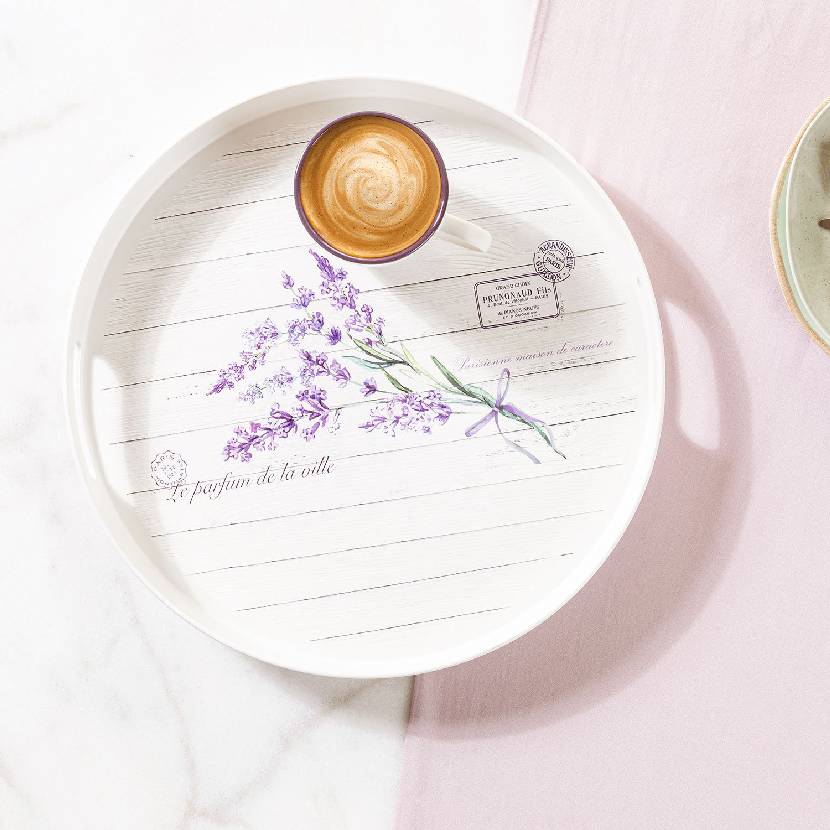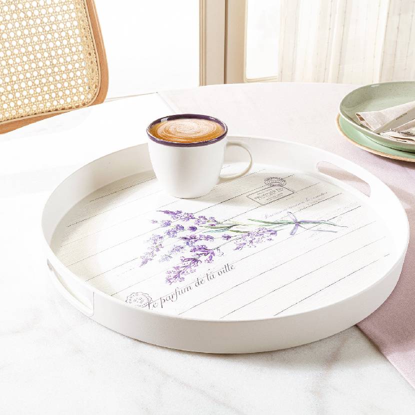سینی گرد اسطوخودوس سینی گرد اسطوخودوس که به شما امکان میدهد خوراکیهایی مانند چای و قهوه را با خیال راحت برای مهمانان خود ببرید، دارای سطحی شیک است. این سینی سرو که به لطف شکل خود برای صرفهجویی در فضا در آشپزخانه شما طراحی شده است، با مزایای مادام کوکو به آشپزخانه شما میآید.