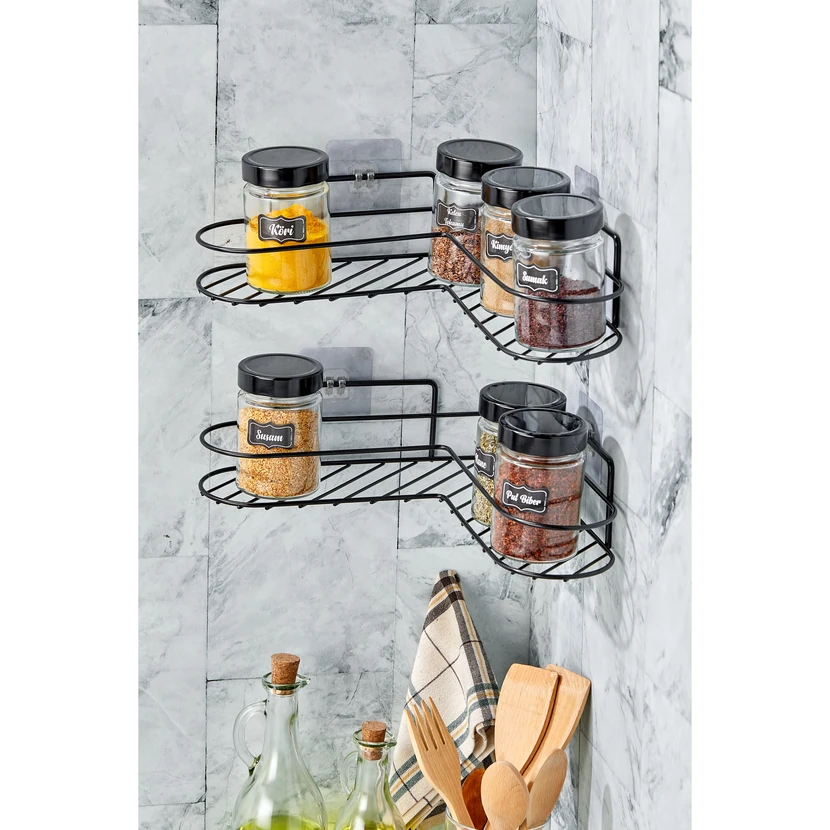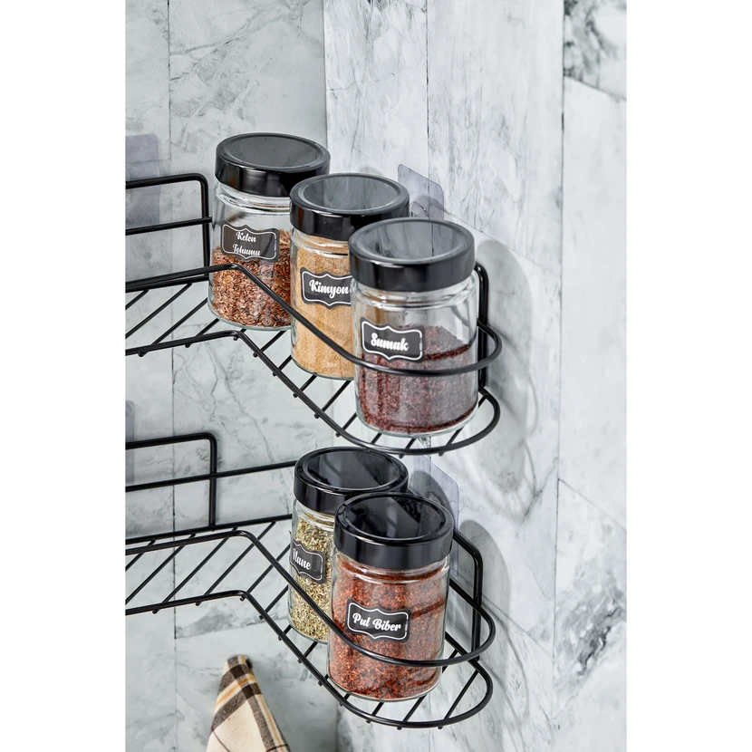 - شلف آشپزخانه دوعددی ویپگراس، قفسه چسبی فلزی مشکی برای نظمدهی ادویهها و لوازم کوچک است؛ طراحی جمعوجور و مدرن مناسب فضاهای کوچک آشپزخانه.