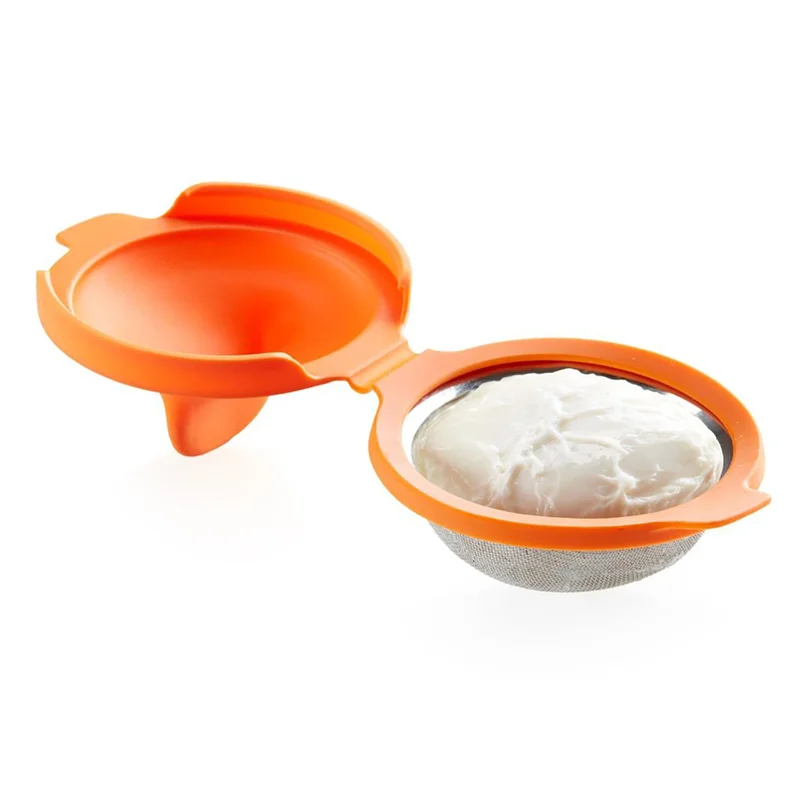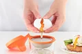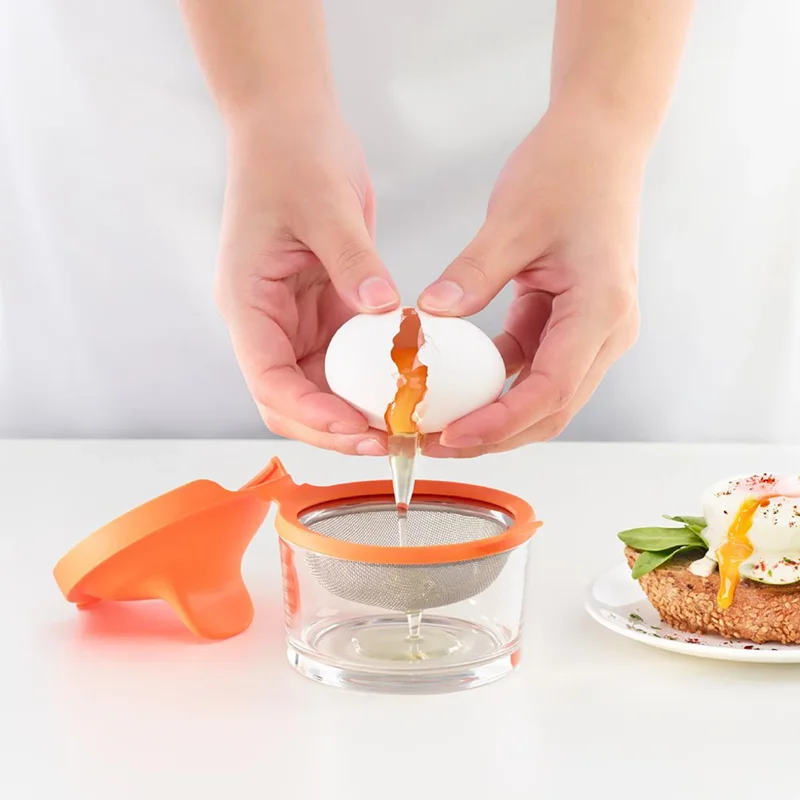 2) قالب تخم مرغ را روی یک لیوان قرار دهید و یک تخم مرغ را داخل آن بشکنید. میعان اضافی از صافی جریان می یابد. نگران نباشید، سفیده تخم مرغ باقی می ماند!