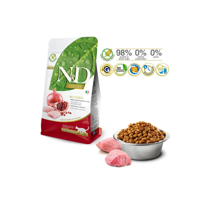 - غذای خشک گربه بدون غلات با طعم مرغ و انار، مخصوص گربههای عقیمشده؛ فرمول باکیفیت و پروتئینی برای حفظ وزن سالم و هضم آسان، طعمپذیری بالا و مناسب مصرف روزانه.