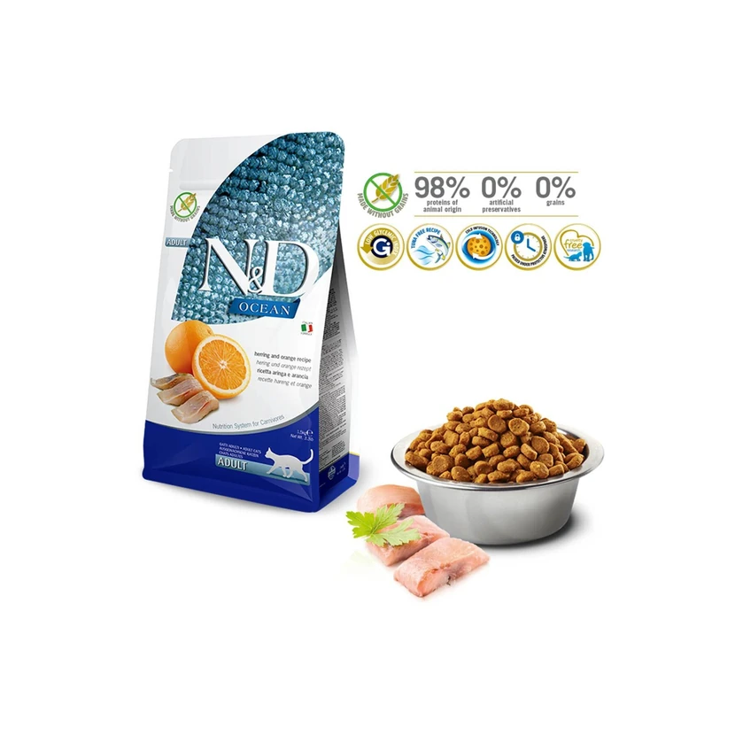 - غذای گربه بالغ اندی اوشن، فرمول بدون غلات با طعم ماهی رینگا و رایحه پرتقال؛ طعمی خوشایند و مناسب برای تغذیه روزانه گربههای بالغ.