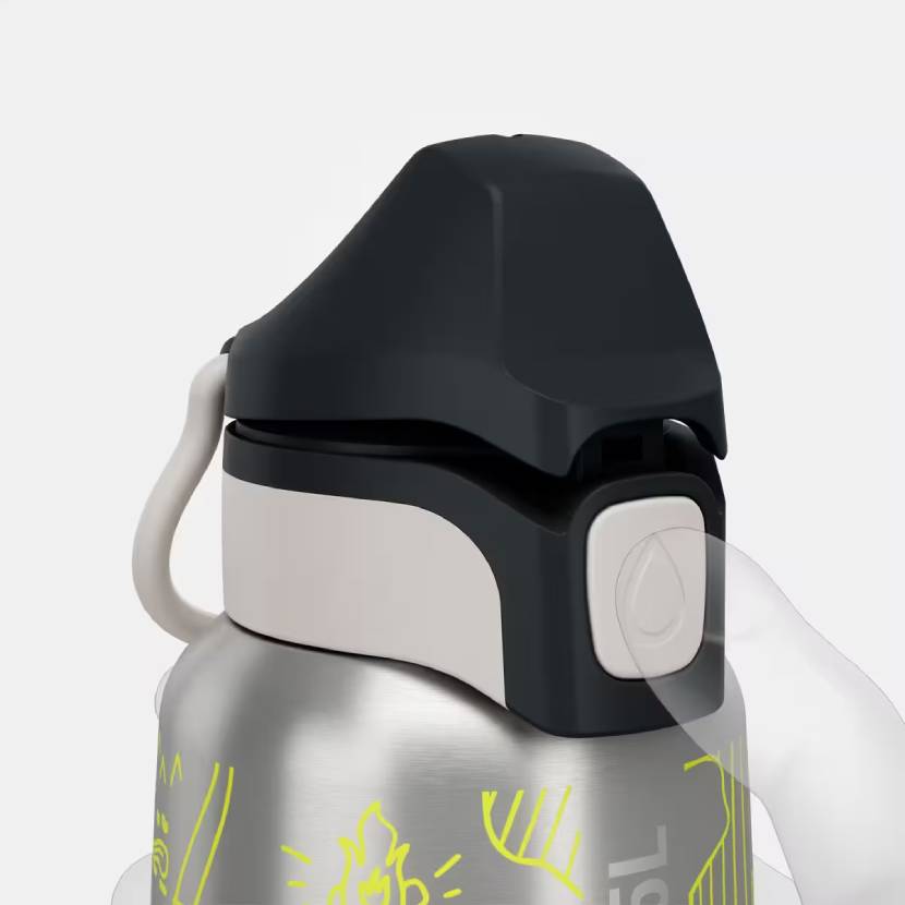 این بطری آب دارای دربی است که مخصوص کودکان طراحی شده است. برای اطمینان از ایمنی کودک، درپوش دارای یک دریچه سیلیکونی شفاف در داخل است که جریان آب را محدود میکند و حتی زمانی که درپوش باز است، آب را مسدود میکند و از خروج آب در زمانی که بطری آب به صورت عمودی قرار ندارد، جلوگیری میکند.
