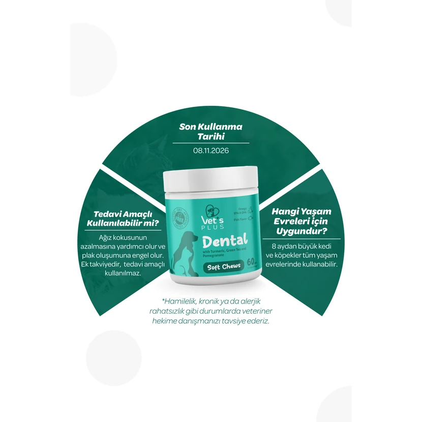 - قرصهای جویدنی دنتال وتاس پلاس (60 عدد) برای حفاظت روزانه از سلامت دهان و دندان سگها و گربهها طراحی شدهاند و با طعم مورد علاقه حیوان مصرف سادهای دارند.