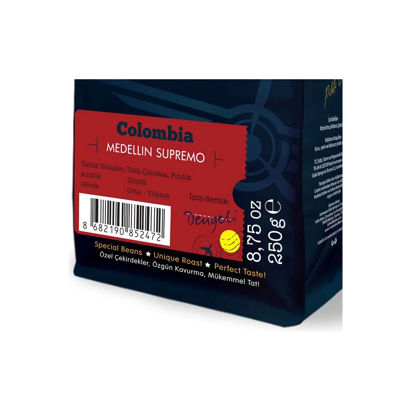 - قهوه دانهای کلمبیا مدلین سوپریمو مولیندو، بسته 250 گرم، از قهوههای محلی کلمبیا با تازگی بستهبندی شده است و برای تهیه اسپرسو و روشهای دمآوری خانگی مناسب است.