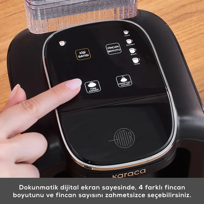 هاتیر اکنون یک مخزن آب دارد تا قهوه ترکی شما به سریع ترین و آسان ترین روش آماده شود! قهوه ساز ترکی Hatır Su که به لطف مخزن خود آب قهوه را به صورت خودکار دریافت می کند، قهوه شما را در دمای ایده آل و قوام کامل آماده می کند. ظرفیت پخت تا 5 فنجان قهوه ترک یا قهوه بو داده در یک زمان را دارد. قهوه شما را با توجه به اندازه فنجان شما با گزینه های Small، Standard، Large و Double دم می کند.