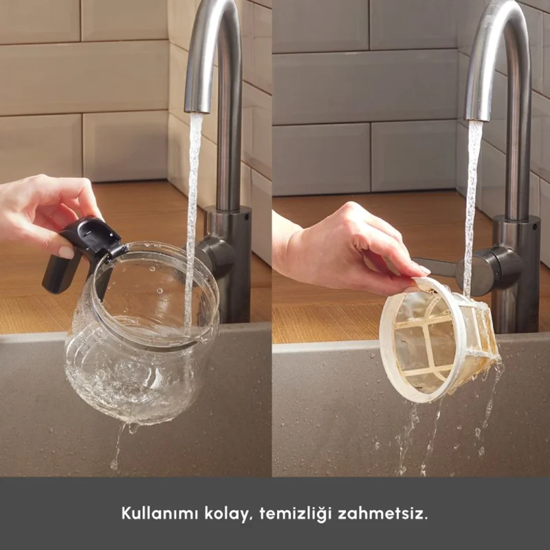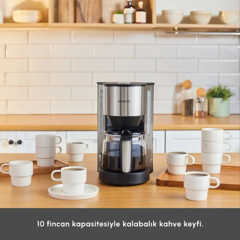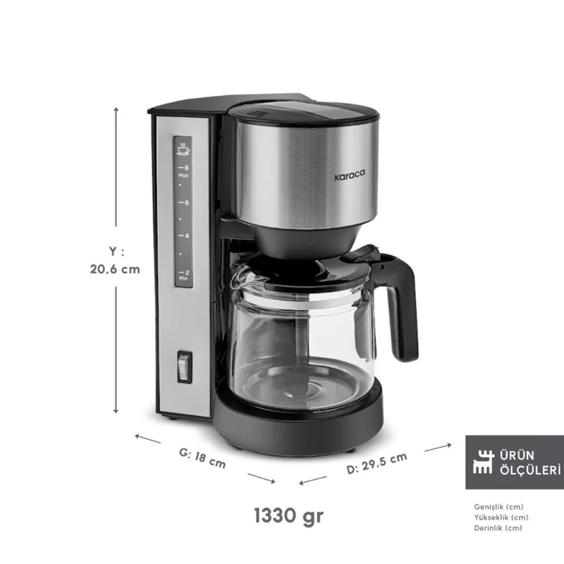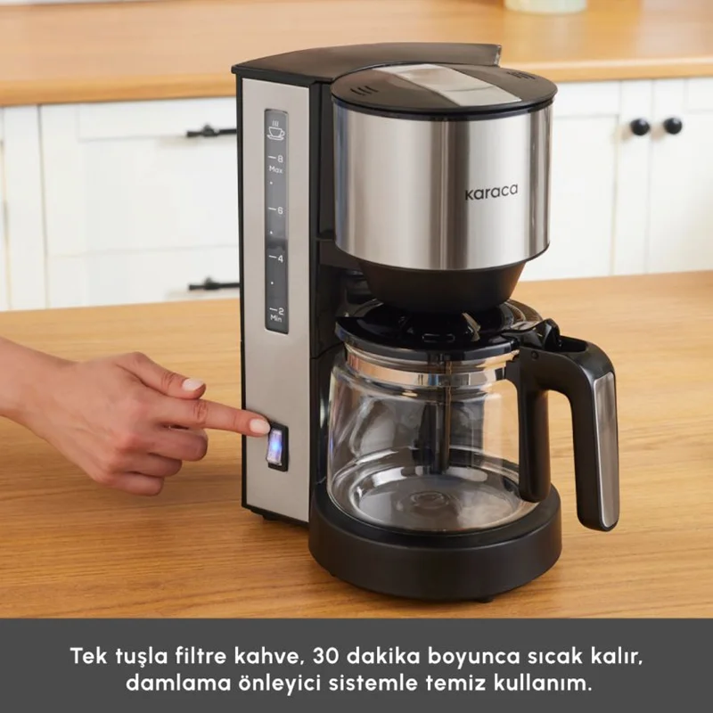 دستگاه قهوه ساز Karaca FreshBrew Inox Filter با ساختار استیل ضد زنگ خود، بادوام، بادوام و شیک است. حجم آب ۱.۲۵ لیتری آن که حتی برای گروههای پرجمعیت مهمانان شما نیز کافی خواهد بود، لذت نوشیدن ۱۰ فنجان قهوه را به طور همزمان ارائه میدهد. فیلتر استیل ضد زنگ آن که میتوانید به راحتی با نگه داشتن آن در زیر آب تمیز کنید، مشکل فیلترهای کاغذی را از بین میبرد. سیستم ضد چکه از چکه کردن قهوه هنگام برداشتن قوری جلوگیری میکند و استفادهای تمیز را فراهم میکند. با ویژگی گرم نگه داشتن ، قهوه شما به مدت ۳۰ دقیقه پس از دم کردن داغ میماند. نشانگر شفاف سطح آب به شما امکان میدهد میزان آب موجود در دستگاه خود را ببینید. قوری که به راحتی با دست قابل شستشو است و سطح بیرونی اینوکس آن که با دستمال تمیز میشود، تمیز کردن را آسان میکند.