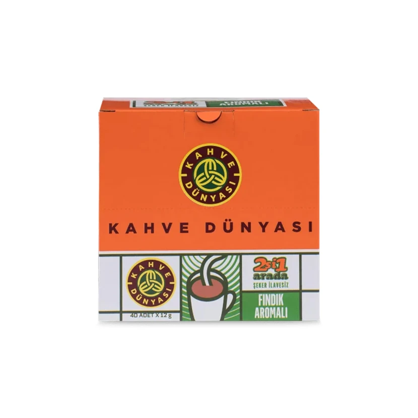 - قهوه ۲ در ۱ فندقی Kahve Dünyası در بستهبندی ۴۰ ساشه؛ ترکیبی آماده از قهوه و خامهپودر با طعم فندق برای تهیه سریع و لذیذ یک فنجان در هر زمان.