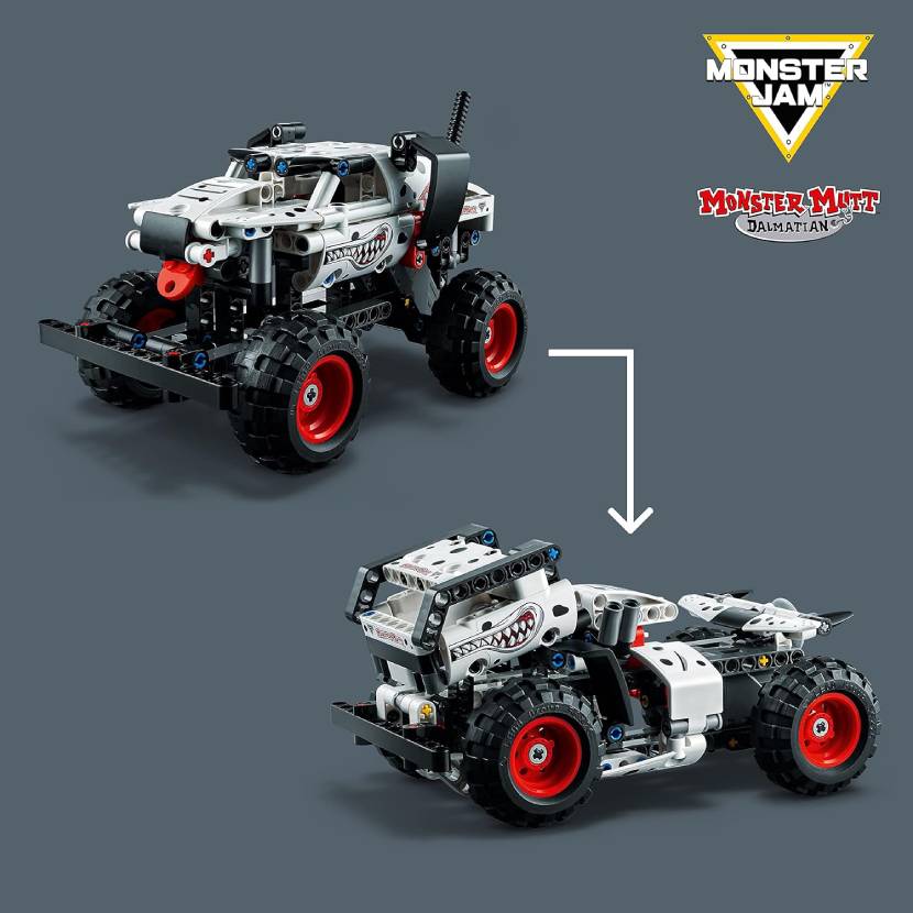 ست LEGO Technic 42150 مدل Monster Jam Monster Mutt Dalmatian یک ماشین هیولایی کشنده و جذاب از سری Monster Jam است که با ظاهری الهامگرفته از سگ نژاد دالمیشن طراحی شده. این مدل با جزئیات ظاهری بامزه مثل گوشها و دم متحرک، علاوه بر سبک هیولایی و چرخهای بزرگ، بازی را برای کودک هیجانانگیز و سرگرمکننده میکند.این مجموعه دارای قابلیت کشبک (Pull-Back) است؛ یعنی با کشیدن ماشین به عقب و رها کردن، مدل با سرعت به سمت جلو حرکت میکند. همچنین این ست مدل 2 در 1 است و امکان تبدیل آن به یک Monster Truck دیگر را نیز فراهم میکند. ساخت این مدل دستورزی، خلاقیت و درک مکانیکی کودک را تقویت میکند.