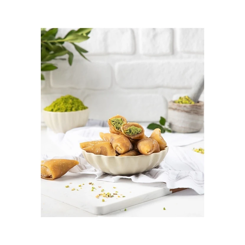- مسکا پستهای آنتپ پازاری 500 گرمی؛ شیرینی سنتی با مغز پسته تازه و خمیر ترد که از پستههای باکیفیت تهیه شده تا طعم طبیعی و بافتی کرانچی و لذیذ ارائه دهد.