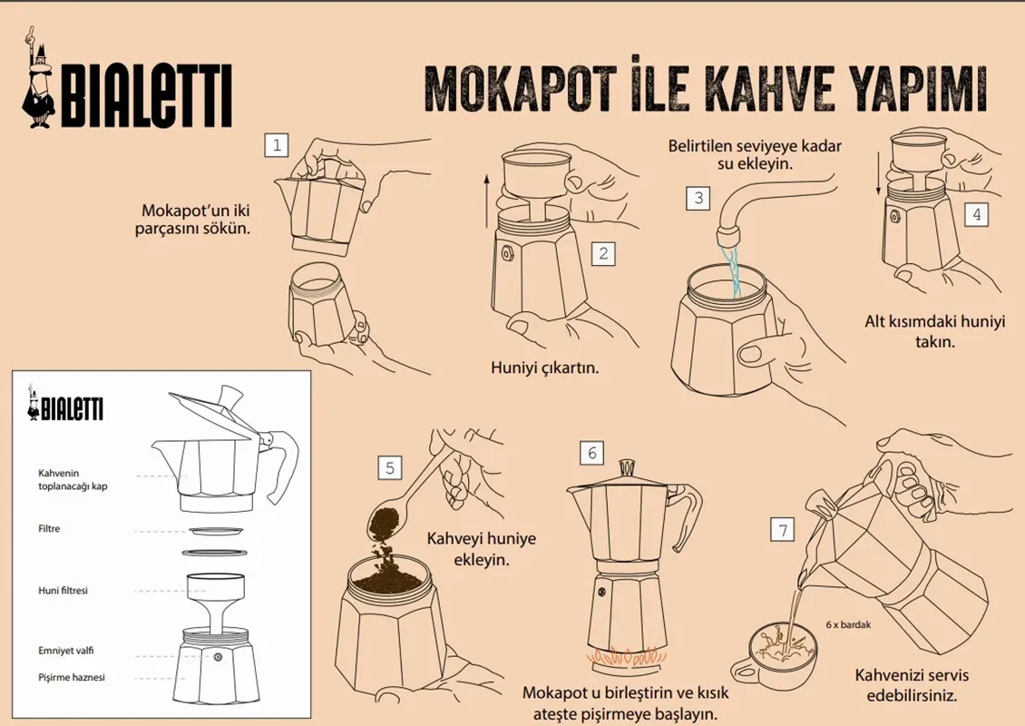 از سه قسمت تشکیل شده است: مخزن آب از پایین به بالا، فیلتری که قهوه آسیاب شده را در آن قرار می دهید و محفظه ای که اسپرسو در آن پر می شود.