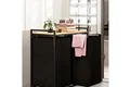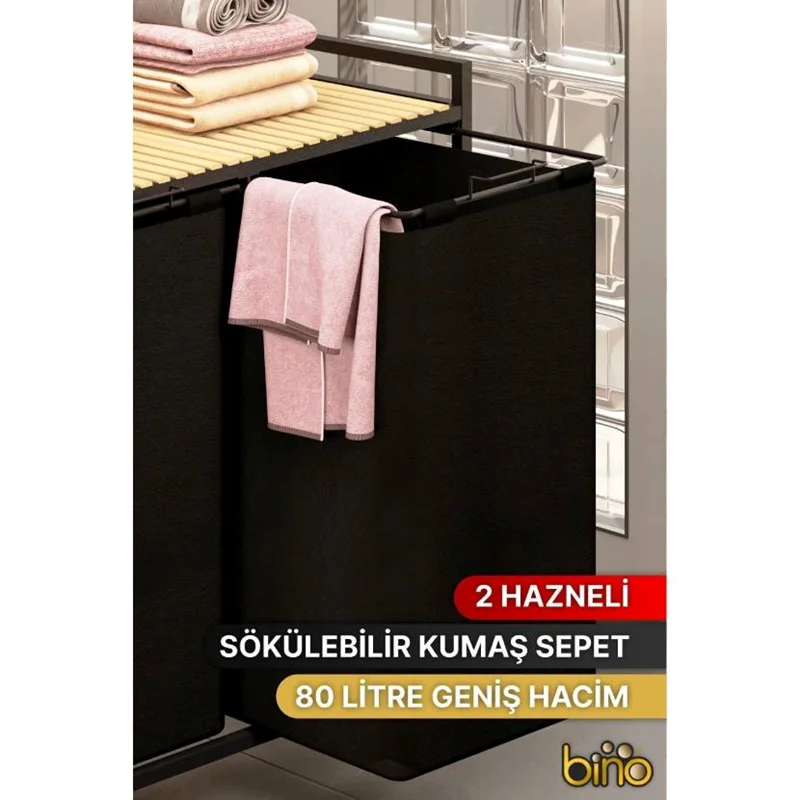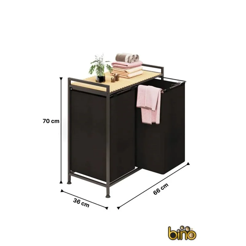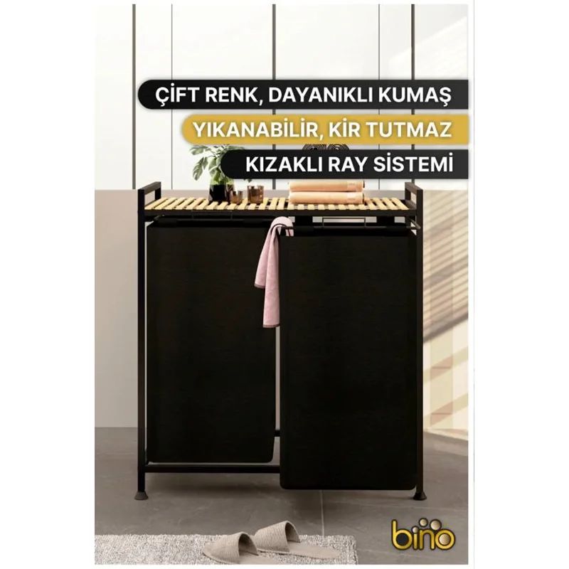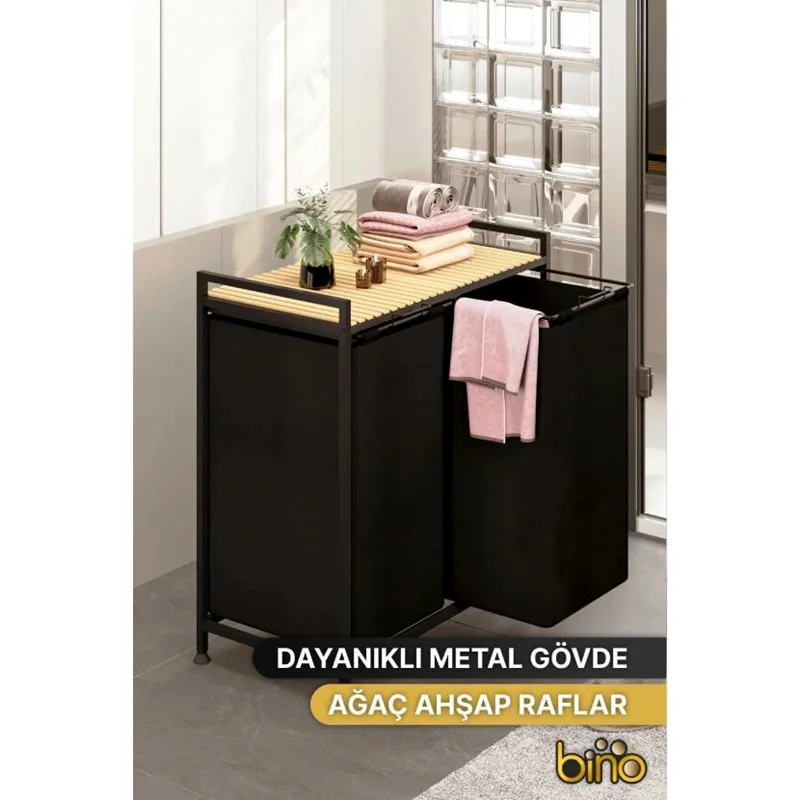 Bino Çamaşır Sepeti Kirli Sepeti Ahşap Banyo Dolabı Büyük Boy Geniş 2 Bölmeli Kumaş Kirli Sepeti