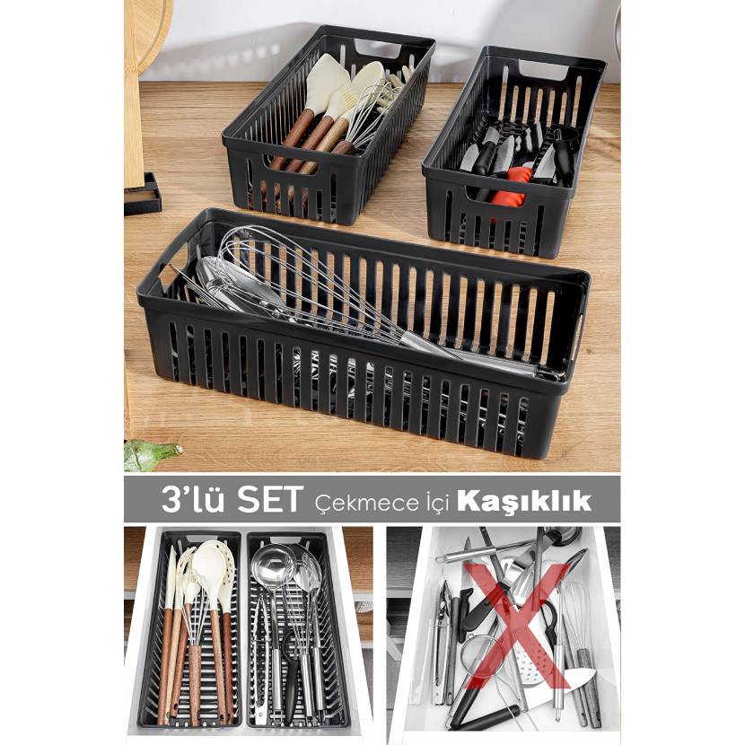 Meleni Home 3'lü Modüler Kaşıklık Seti - Mutfak Düzenleyici Çekmece İçi Organizer Bıçaklık Kepçelik Siyah