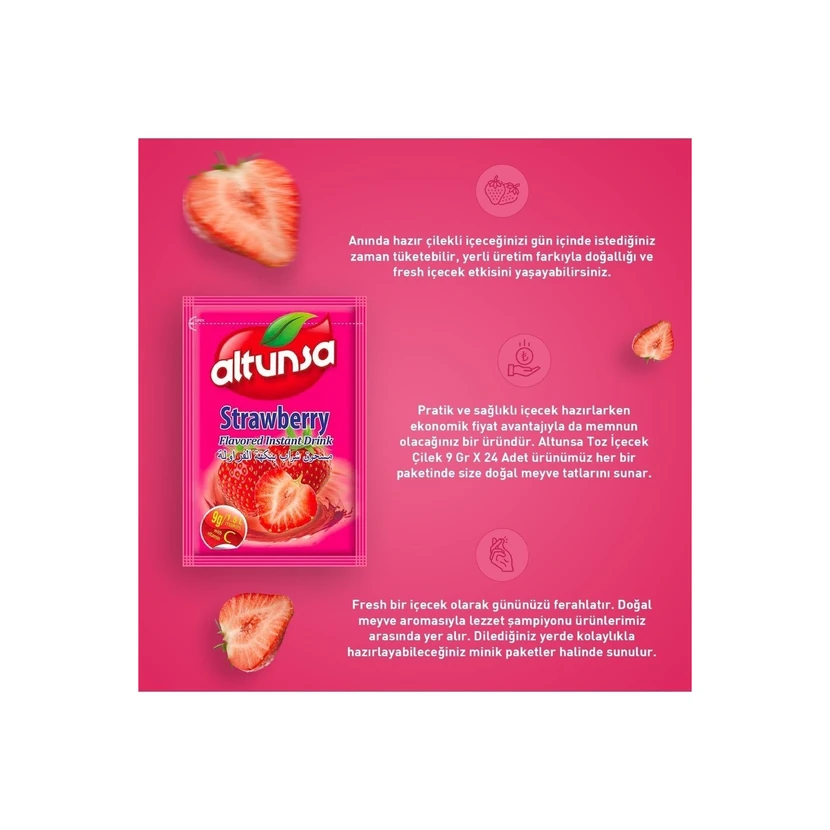 - نوشیدنی پودری توتفرنگی آلتونسا در بستهبندی 24 عددی (هر ساشه 9 گرم) طعمی مطبوع و مناسب برای تهیه فوری نوشیدنی خنک در خانه، محل کار و مهمانیها.