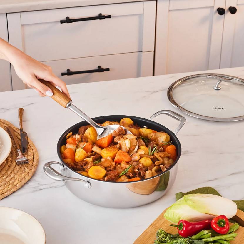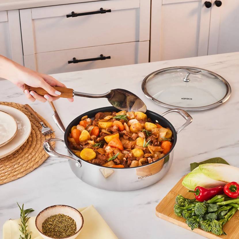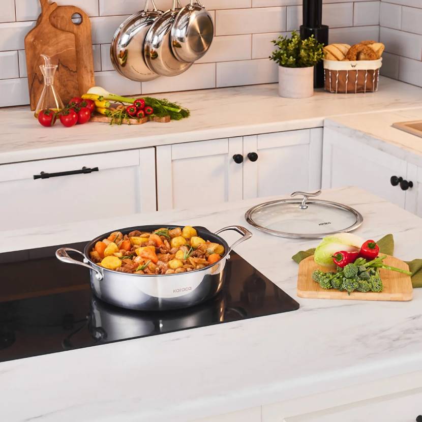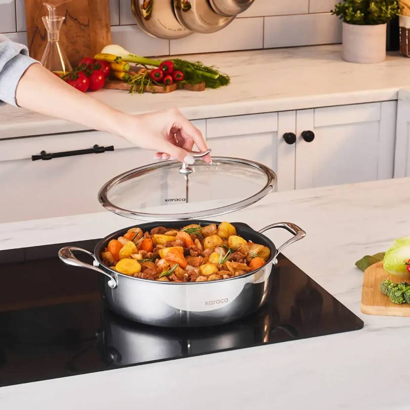 سری پلاسما استیل ۳PLY 316+ از فولاد ضد زنگ با کیفیت ۳۱۶ ساخته شده است که به دلیل دوام عالی خود شناخته شده است و توسط برندهای ساعت مشهور جهان استفاده میشود. این فولاد حداکثر مقاومت را در برابر دماهای بالا و خراش ارائه میدهد. بادوام و بهداشتی است. علاوه بر این، حاوی مواد شیمیایی مضر مانند PFAS که سلامت انسان را به خطر میاندازند، نیست. مناسب برای همه اجاق گازها و فرها، از جمله القایی، پلاسما استیل 3PLY 316+ گرما را به طور یکنواخت در همه جا پخش میکند و به پخت خوشمزهتر غذا کمک میکند. سری پلاسما استیل 3PLY 316+ قابل شستشو در ماشین ظرفشویی و تمیز کردن آسان است! با سری کاراجا پلاسما استیل 3PLY 316+ ، طعم را به وعدههای غذایی خود و راحتی را به آشپزخانه خود بیاورید، یک وسیله ضروری در آشپزخانه شما !