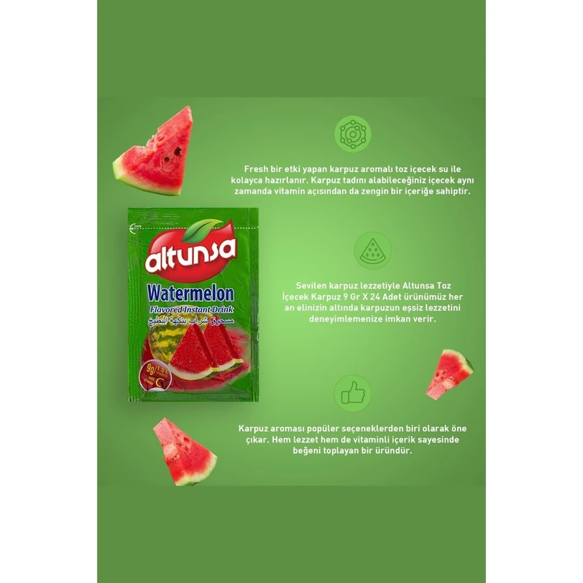 - پودر نوشیدنی سرد با طعم هندوانه آلتونسا؛ هر ساشه 9 گرم و در بستهبندی 24 عددی عرضه میشود. آمادهسازی سریع با آب سرد، مناسب برای خنکشدن در روزهای گرم.