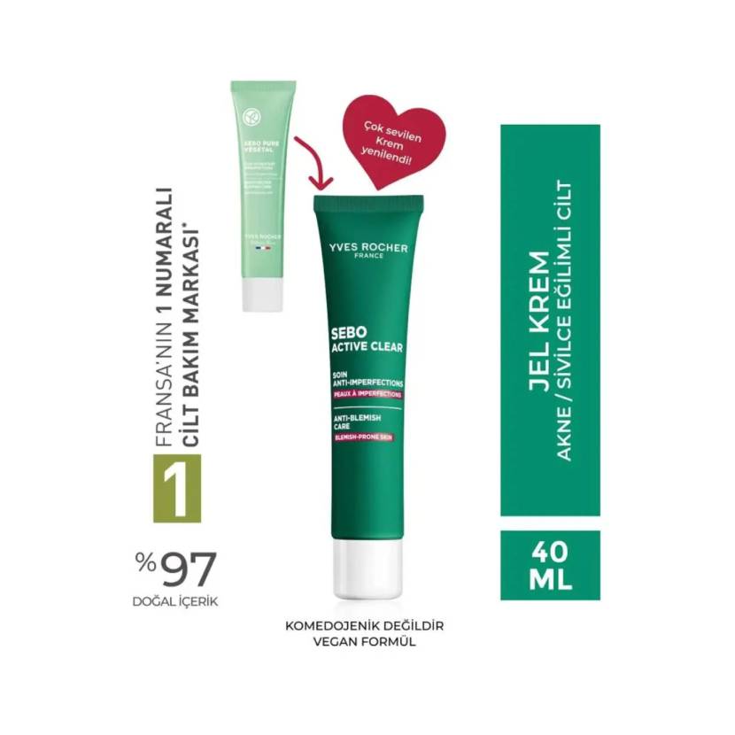کرم Yves Rocher Sebo Active Clear Anti-Acne محصولی تخصصی برای پوستهای چرب و مستعد آکنه است که با ترکیب مؤثر سوکسینیک اسید، آلانتوئین و آلوئهورا تولید شده تا جوشها را کاهش دهد، قرمزی و التهاب را آرام کند و پوست را به تعادل طبیعی بازگرداند.