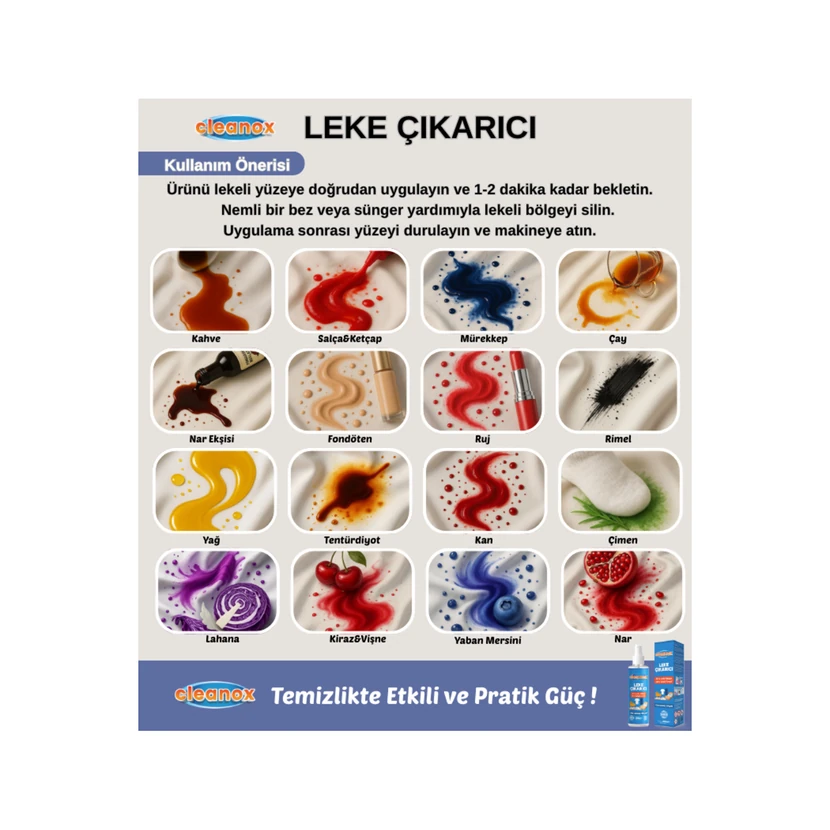 • کلینوکس مایع لکه‌بر 200 میلی‌لیتر: پاک‌کننده‌ای قوی برای حذف لکه‌های چربی، قهوه و غذا از پارچه‌ها. فرمول محافظ الیاف، استفاده آسان در خانه، مؤثر و سریع. نکته: برای پارچه‌های حساس ابتدا تست روی قسمت مخفی انجام دهید.