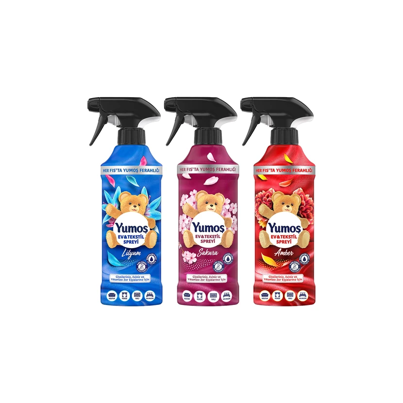 - اسپری یوموش با رایحههای امبر، ساکورا و لیلیوم در اندازه 450 میلیلیتر، برای تازهسازی سریع فضاها و پارچهها طراحی شده و عطری خوش و دلپذیر ارائه میدهد.